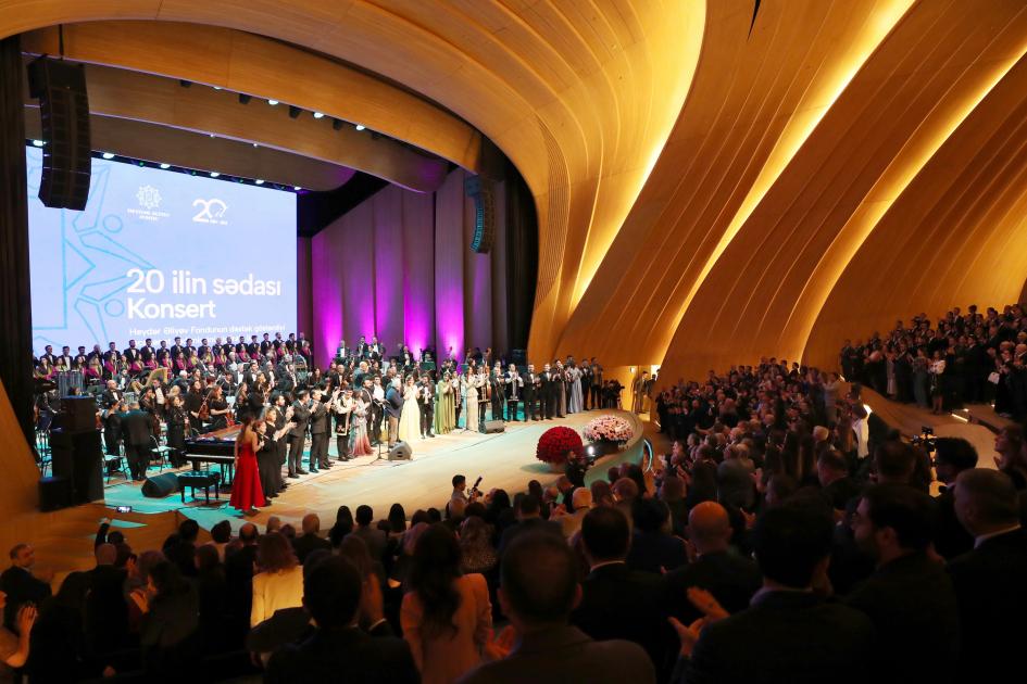 Mayın 4-də Heydər Əliyev Mərkəzində “20 ilin sədası” adlı konsert proqramı təqdim olunub. Konsert Fondun yaradılmasının 20 illiyinə həsr edilib. Bizim.Media xəbər verir ki, konserti Azərbaycan Respublikası Prezidentinin köməkçisi, Heydər Əliyev Fondunun icraçı direktoru Anar Ələkbərov, mədəniyyət naziri Adil Kərimli, Milli Məclisin deputatları və digər qonaqlar izləyiblər. Konsert proqramı Heydər Əliyev Fondunun fəaliyyətinə, mədəniyyət sahəsində gördüyü işlərə dair videoçarxın nümayişi ilə başlayıb. Videoçarxda diqqətə çatdırılıb ki, Heydər Əliyev Fondu 2004-cü ildə Ulu Öndərin siyasətini əks etdirmək, yaratdığı milli dövlətçilik ideyalarını yeni nəsillərə daim aşılamaq niyyətindən irəli gələrək yaradılıb. Mehriban xanım Əliyevanın rəhbərlik etdiyi Fond 20 il ərzində saysız-hesabsız uğurlara nail olub, mədəniyyət, təhsil, səhiyyə və digər sahələrdə ciddi islahatların aparılmasına töhfəsini verib. Heydər Əliyev Fondu, həmçinin ölkəmizin dünyada təbliği və zəngin dəyərlərimizin tanıdılması istiqamətində yorulmaz fəaliyyət göstərib. Fondun yubiley konserti həm iştirakçıları, həm də repertuarı ilə rəmzi məna daşıyıb. Belə ki, bu il yaranmasının 20 ili tamam olan Heydər Əliyev Fondu fəaliyyəti dövründə hər zaman gənc istedadlara, mədəniyyət və incəsənət sahəsinin inkişafına dəstək göstərib, mədəniyyətimizin geniş təbliğinə yönələn layihələr həyata keçirib. Heydər Əliyev Fondu istər gənclərimizin təhsil almasına, istərsə də beynəlxalq müsabiqə və festivallarda iştirakına dəstək olub. Fondun ayrı-ayrı sahələrdəki layihələri, o cümlədən muğam müsabiqələri, milli, klassik və caz musiqisi ilə bağlı layihələri, müxtəlif musiqi festivalları yeni istedadların üzə çıxarılmasına, onların inkişafına təkan verib. Bugünkü konsert proqramında da məhz bu incəsənət xadimləri, - yaradıcılıqlarında Heydər Əliyev Fondunun iz qoyduğu, dönüş və sıçrayış yaratdığı, dəstək göstərdiyi mədəniyyət və incəsənət xadimləri, - Azər Zadə (tenor), Azər Zeynalov (tenor), Ceyla Seyidova (violin), Elçin Əzizov (bariton), Emil Əfrasiyab (piano), Elvin Hoca Qəniyev (violin), Fərhad Bədəlbəyli (piano), İsfar Sarabski (piano), Mirələm Mirələmov (xanəndə), Murad Adıgözəlzadə (piano), Samir Cəfərov (tenor), Təyyar Bayramov (xanəndə) və digərləri çıxış ediblər.