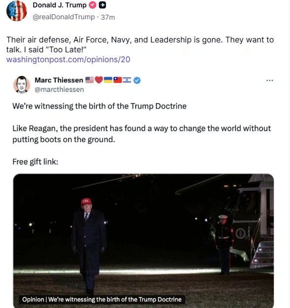 ABŞ Prezidenti Donald Tramp İran tərəfi ilə danışıqlardan imtina edib. Bizim.Media xəbər verir ki, o bu barədə özünün "Truth Social" sosial şəbəkə hesabında yazıb. Prezident qeyd edib ki, İranın hava hücumundan müdafiə (HHM) sistemi, hərbi-hava qüvvələri (HHQ), hərbi-dəniz qüvvələri (HDQ) və rəhbərliyi "məhv edilib". "Onlar danışıqlar istəyirlər. Mən isə dedim, artıq gecdir!", - Tramp yazıb. Xatırladaq ki, Tramp daha əvvəl İran rəsmilərinin danışıqlar üçün ona müraciət etdiyini bildirmişdi. Lakin İran İslam Respublikasının Ali Milli Təhlükəsizlik Şurasının katibi Əli Laricani rəsmi Tehranın ABŞ-la heç bir danışıqlara getməyəcəyini açıqlamışdı.